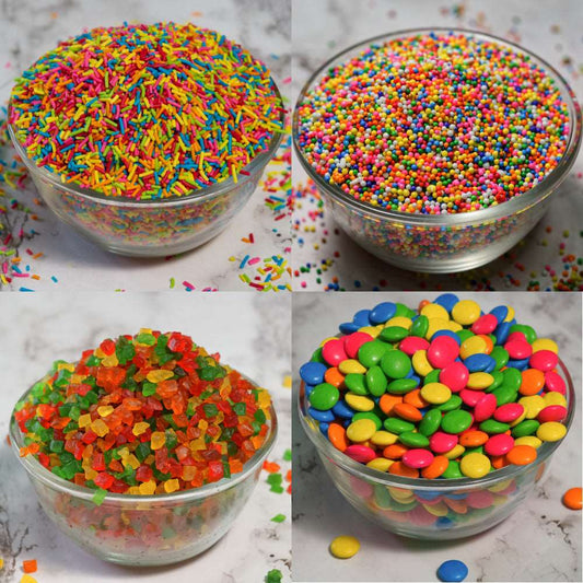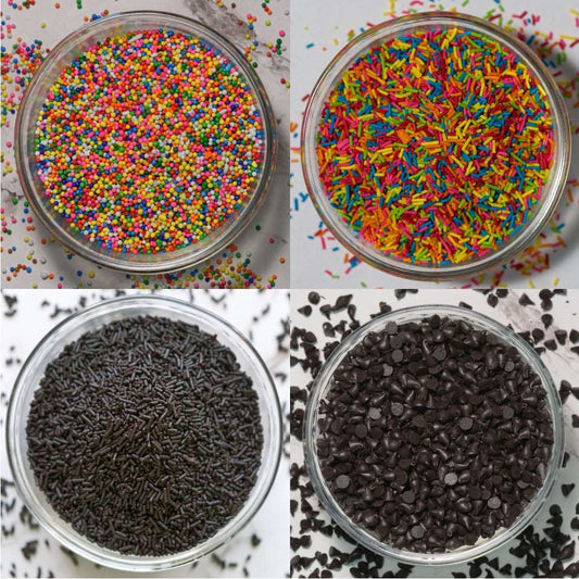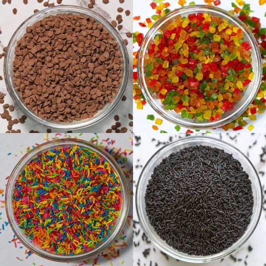 Muffin Decoration Combo of Milk Choco Chips, Tutti Frutti, Rainbow Vermicelli, Dark Vermicelli