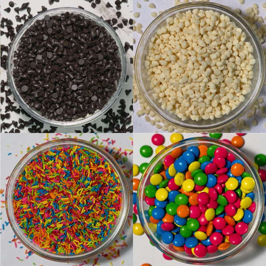 Cookie Decoration Combo of Dark Choco Chips, White Choco Chips, Rainbow Vermicelli, Choco Beans