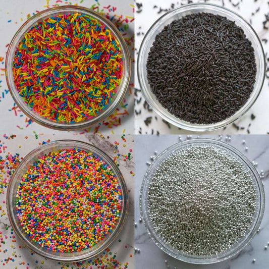 Cupcake Decoration Combo of Rainbow Vermicelli, Dark Vermicelli,Rainbow Sugar balls, Silver Balls