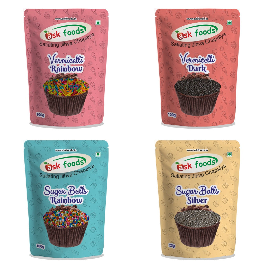 Cupcake Decoration Combo of Rainbow Vermicelli, Dark Vermicelli,Rainbow Sugar balls, Silver Balls