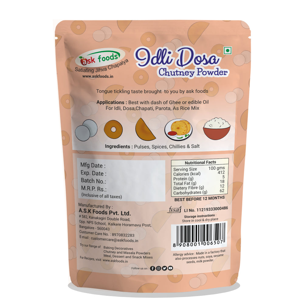 - Idli Dosa Chutney Powder is a protein-rich chutney powder made with the finest quality grams, chilies, and spices. It is commonly used as a substitute for chutney and as travel food.