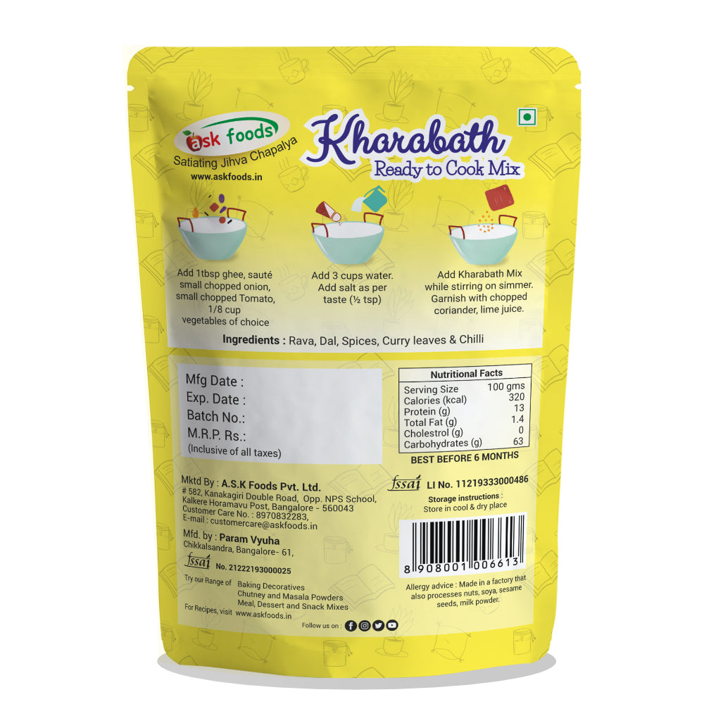 Kharabath Ready to Cook Mix is a perfect choice for busy families who want a tasty and healthy breakfast or snack option that can be prepared quickly and easily. It contains all the necessary ingredients to make Kharabath easily. One typically needs to boil water and add the mix to it, along with any additional vegetables or garnishes as desired until it thickens and becomes creamy. ( Recipe below )
