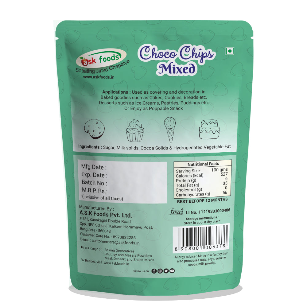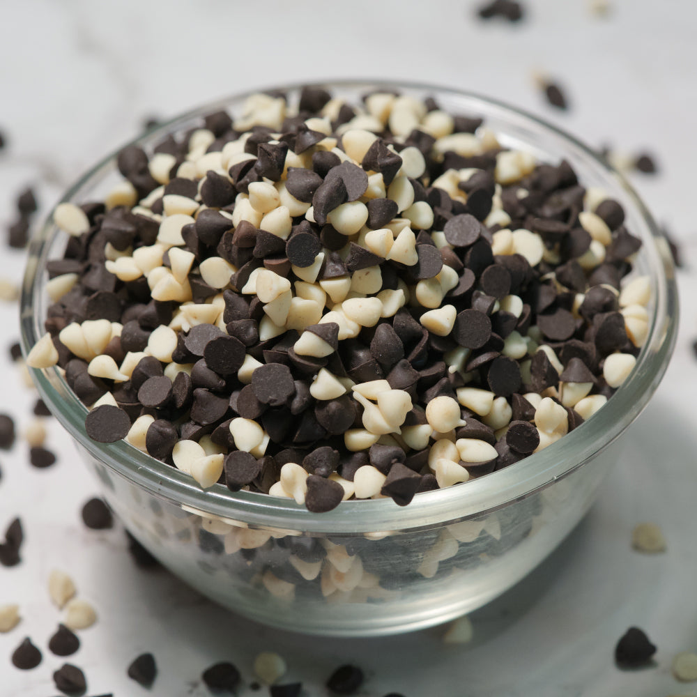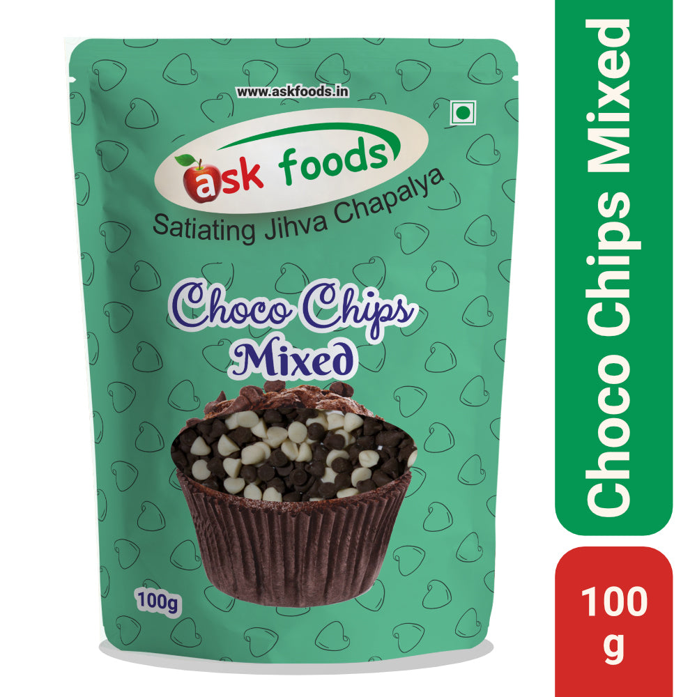 Mixed chocolate or choco chips are chunks of dark and white chocolate or choco chips individually that are flat-bottomed and tear-shaped. They have a rich, chocolatey flavor and are known for their health benefits, including being a source of antioxidants.
