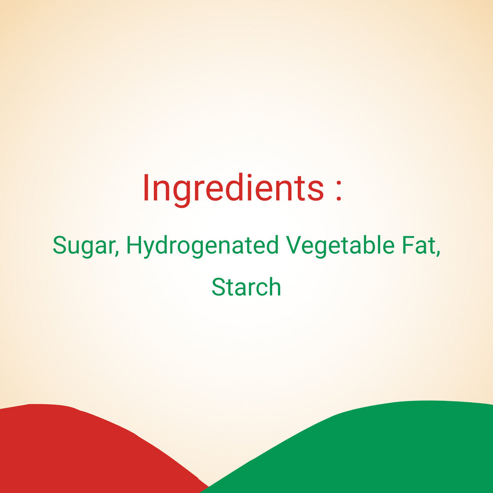 Sugar, Hydrogenated Veg fat & emulsifiers