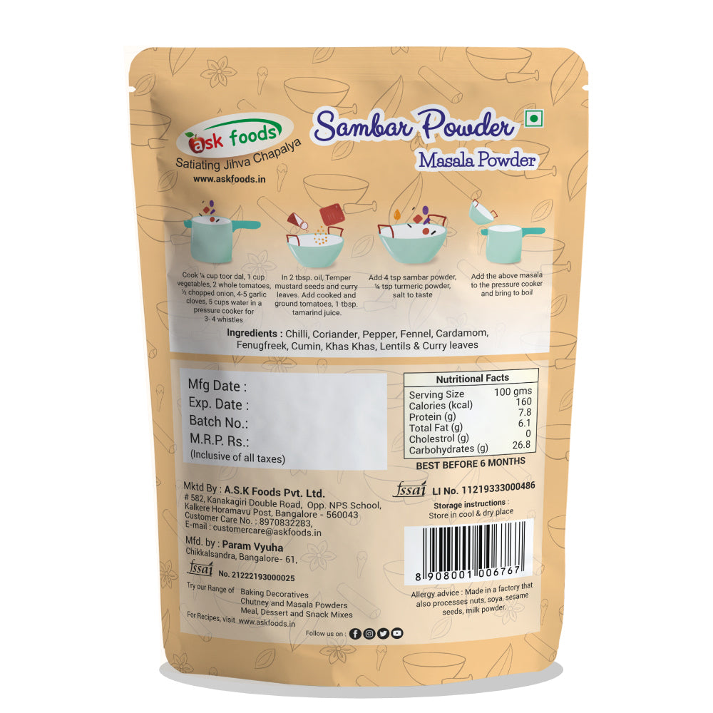 Sambar is a popular South Indian stew made with vegetables and lentils, seasoned with a unique blend of spices and tamarind juice. It is not only eaten with rice, but can also be enjoyed with a host of other dishes such as dosa, idli, pongal, upma or vada. It is versatile in its pairing and pairs well with most food. Sambar powder from the house of Ask Foods is a generational recipe handed down from one generation to the next with every generation adding their own version until it reached perfection. It is a spice blend used to add flavor to the sambar stew.