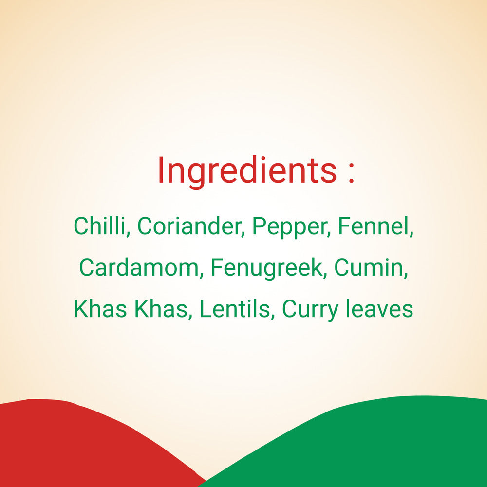 Chilli, Coriander ,Lentils, Pepper, Sesame seeds, Cardamom, Fenugreek, Cumin, Khas Khas, Curry leaves