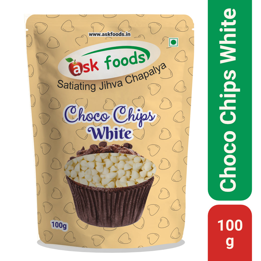 White chocolate or choco chips are chunks of milk chocolate that are flat-bottomed and tear-shaped. These are white in color.